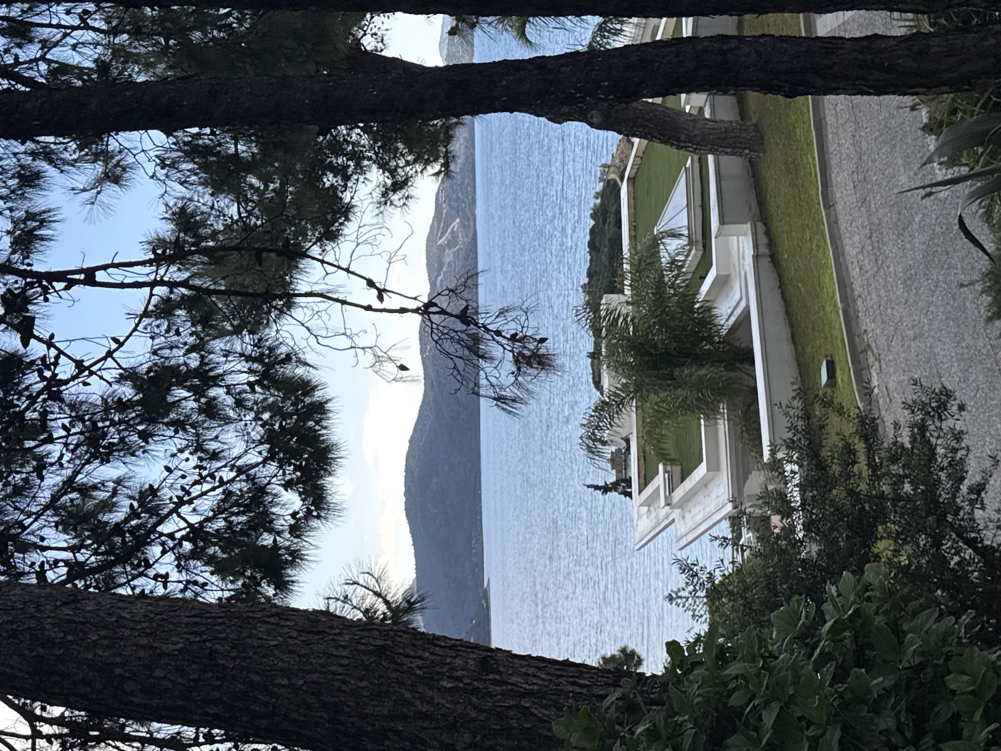 The scene depicts a view of the sea and a distant mountain range framed by the dark silhouettes of pine trees and foliage