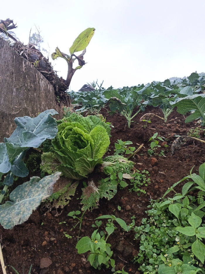 The image depicts a cultivated agricultural field, likely on a hillside, under an overcast sky in Pinnwe, Myanmar (Burma). In the foreground, a large, vibrant green Napa cabbage (Brassica rapa subsp. pekinensis) is centrally positioned, exhibiting crinkled leaves, with some outer leaves showing minor damage or discoloration. To its immediate left, partially visible, are larger, rounder leaves of another green plant, possibly broccoli or a different type of cabbage. The soil is dark brown earth. A weathered, dark brown wooden post or tree stump is visible on the far left, with a small plant sprouting from its top. Rows of young, uniform green plants, consistent with broccoli or cabbage, extend into the midground and background, planted in the dark soil. Various smaller green weeds and ground cover plants are interspersed among the cultivated crops and in the lower foreground. In the far background, a portion of a thatched roof structure is faintly visible through the vegetation, suggesting a human-made dwelling or shelter. No individuals are present in the frame. The scene indicates active agricultural cultivation.