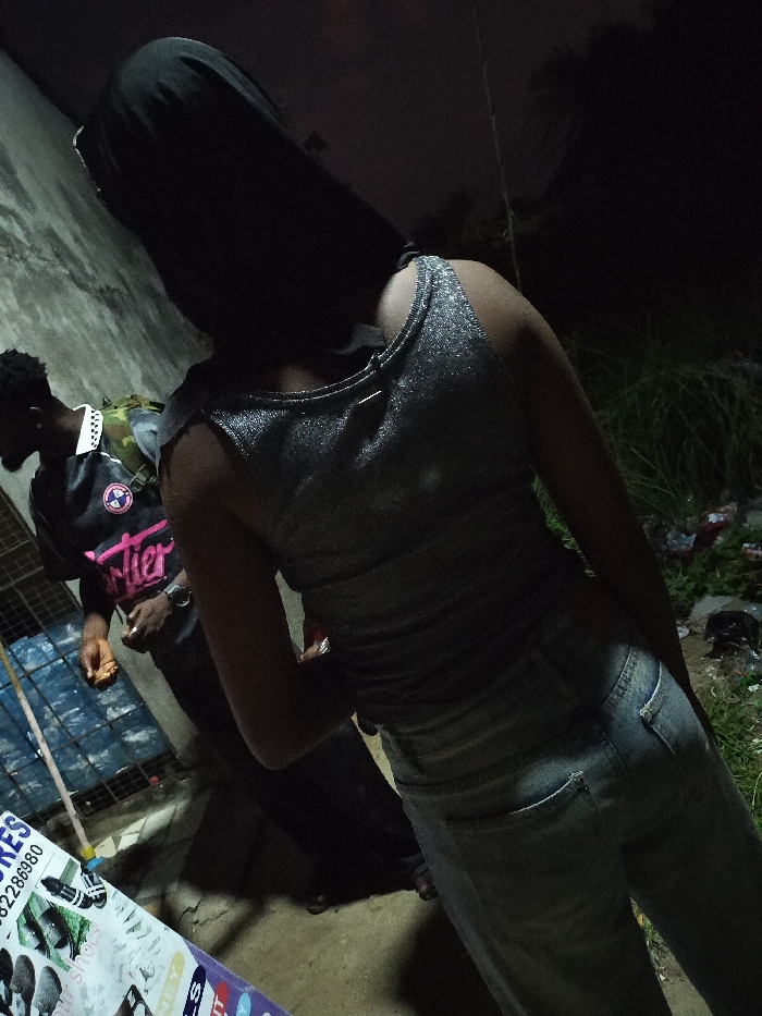 A person in a silver top and light jeans stands with their back to the camera. Their dark hair partially obscures their face. A man wearing a black and pink "Cartier" shirt is to the left, holding a small object. They are positioned in front of a building and a caged area filled with blue containers. The scene appears to be at night, with limited lighting, possibly outdoors near some vegetation and trash.
