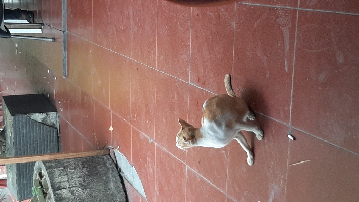 - "An orange and white cat stands on red tile flooring" by FM-G8tBf1, licensed under CC BY 4.0