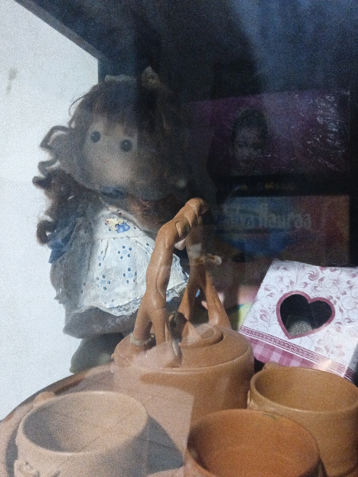 This image, taken in Malungon, Philippines, displays an indoor arrangement of decorative items, likely viewed through a reflective transparent surface. In the foreground, a miniature tea set made of terracotta-colored material is visible, comprising several small cups and a teapot. The teapot's handle is an arched structure depicting two abstract figures with entwined limbs. Positioned behind the tea set, a doll with dark, curly hair and large, dark eyes wears a light-colored dress featuring blue floral patterns and white lace trim. The background on the left consists of a plain, light-colored surface. The right and upper background shows a dark shelving area containing a purple box with a faded image of a person's face, along with other indistinct items. In the lower right background, a white decorative box with pink patterned borders and a prominent heart-shaped cutout is present. All subjects are static, arranged for display.
