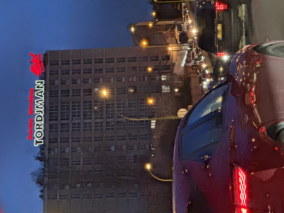 A tall building stands prominently against a dark blue sky, its facade filled with numerous windows. A bright neon sign "Portes blindées TORDJMAN" runs vertically down the building's edge. The street is filled with cars and illuminated by streetlights. A blurred red car takes up a large portion of the foreground, its taillight glowing.