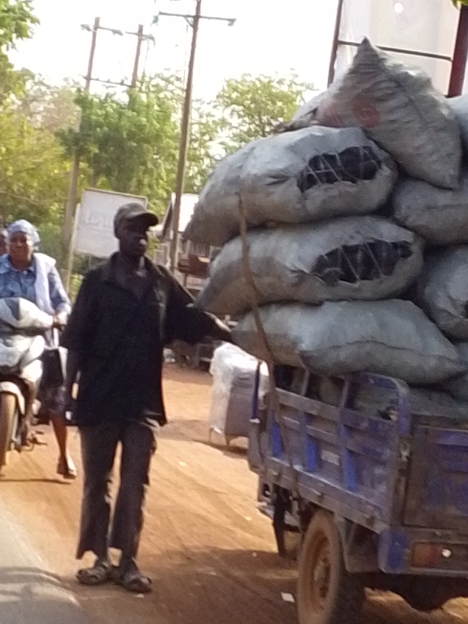 The image displays a daytime street scene in Tamale, Ghana. In the right foreground, a blue cargo vehicle, possibly a three-wheeled utility truck, is heavily loaded with approximately eight large, light-grey sacks containing dark, lumpy material consistent with charcoal, visible through tears in some sacks. A dark-skinned adult male stands center-frame on an unpaved, light brown road, wearing a dark baseball cap, a dark short-sleeved collared shirt, dark trousers, and dark open-toed sandals. He holds a thin, dark wooden stick, extended from the top of the cargo, appearing to brace or guide it. In the left mid-ground, a lighter-skinned adult female, wearing a light head covering and a light blue shirt, is seated on a scooter or motorcycle. Green trees, utility poles with wires, a white sign, and simple structures are visible in the background under a bright sky.