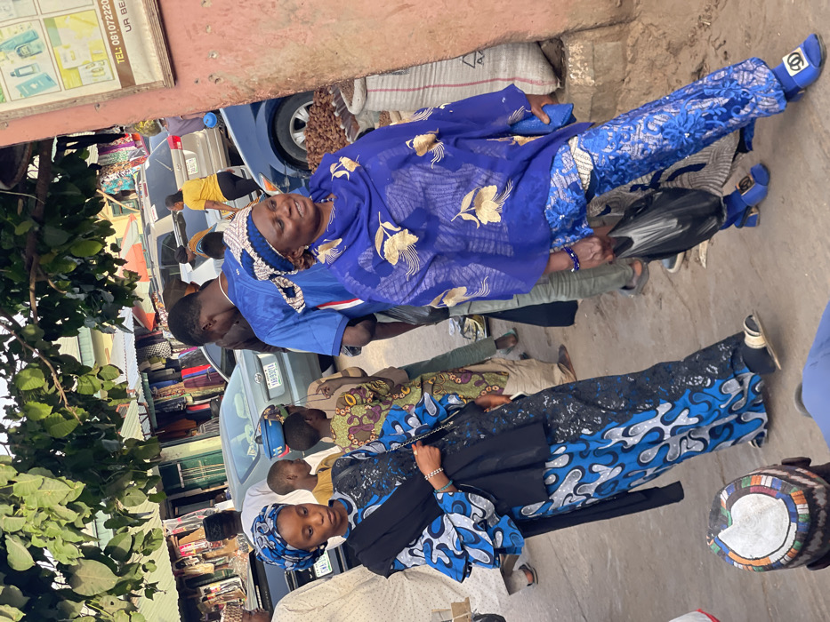 This image depicts a bustling street scene in Samaru, Nigeria, likely a market or commercial district, under daylight conditions. The ground is an unpaved, dusty surface. In the left foreground, a young adult female is visible, facing slightly right and looking downwards. She wears a blue headwrap, a long-sleeved gown featuring a blue, black, and white abstract pattern, and a solid black shawl draped over her shoulders. A silver-colored bracelet adorns her left wrist, and she carries a small black bag with a silver chain strap in her right hand. She wears black and gold sandals. In the right foreground, a middle-aged female is walking, facing slightly right with a faint smile. She wears a royal blue headwrap with white and gold accents, a royal blue sheer top with gold floral patterns over a lighter undergarment, and royal blue pants with intricate white/gold embroidery. She wears blue block-heeled sandals with a gold-colored logo on the strap and a blue bracelet on her right wrist. Her left hand holds a black plastic bag. Numerous other individuals are present in the midground and background, indicating a crowded environment. Behind the first woman, a child balances a small blue pot or bowl on their head. Other pedestrians are visible, including a man in a blue shirt behind the second woman. In the background, several open-front shops display clothing, and multiple vehicles, including a grey sedan (with a partially visible Nigerian license plate 'GWA-158TA'), a silver SUV, and a blue car, are present. Overhanging green tree branches are visible in the upper left. On the right, sacks filled with what appear to be nuts or grains are stacked against a reddish-orange building wall, which also bears a poster displaying product images and partial text including "TEL: 081072220 UR BEA".