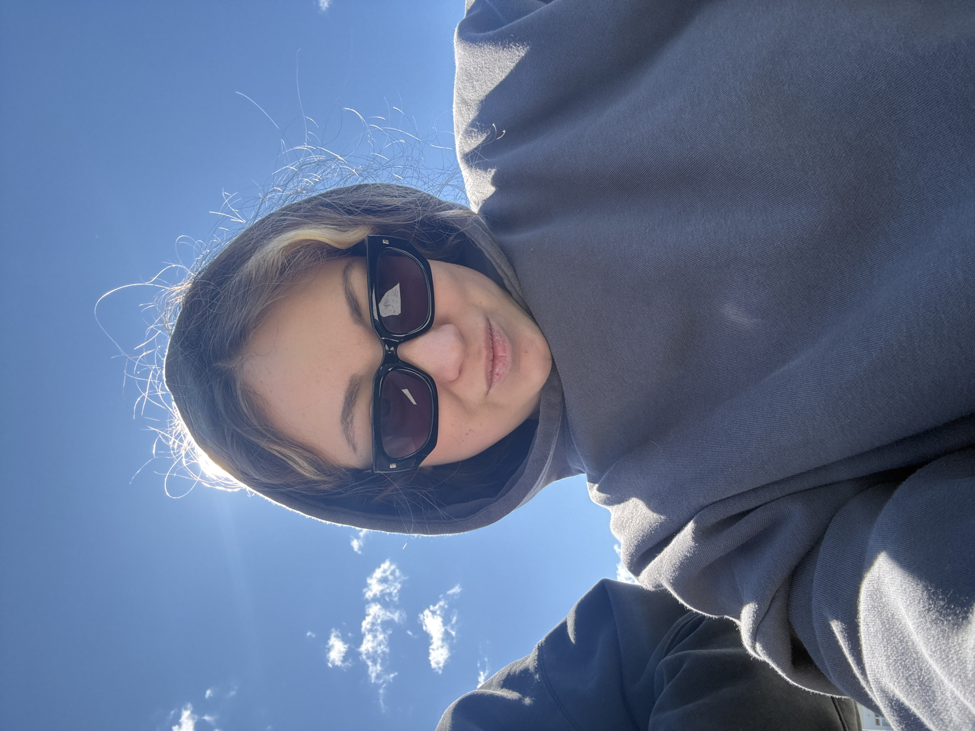 A woman wearing a gray hoodie and dark sunglasses is looking down at the camera. The hood of the sweatshirt is up. Above and behind her is a bright blue sky with scattered white clouds. The location appears to be outdoors during daylight hours. There is no visible indication that this image was taken in the city of Bar, Montenegro.