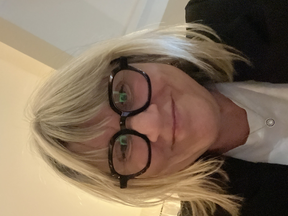 A woman with short, blonde hair and black-rimmed glasses faces the camera