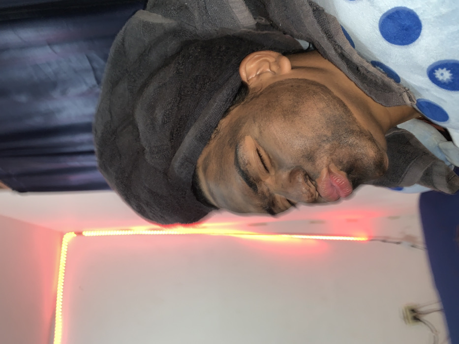 A close-up, slightly blurred, upside-down shot shows a person sleeping under a grey towel-like hood and a blue and white patterned blanket. The person is lying on a white surface with a string of red lights along the edge. Electrical outlets and a corner of a blue object are visible in the background. The person's eyes are closed and lips are slightly pursed.