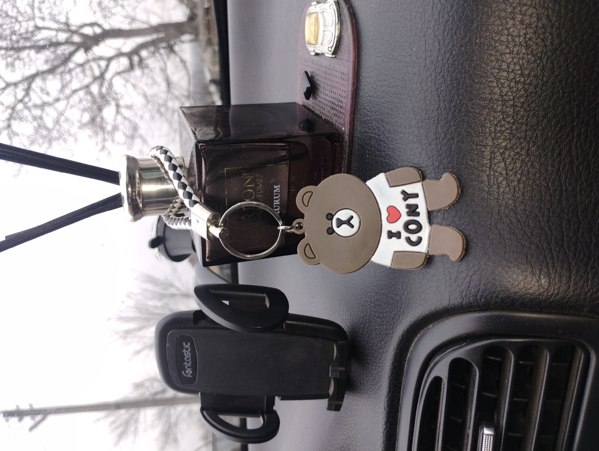 The scene depicts the interior of a vehicle dashboard in Trakiya, Bulgaria, on an overcast day. A black, textured dashboard occupies the lower foreground. On the left, a black 'Fantastic' branded phone mount is secured. Adjacent to it, a black automotive air vent is partially visible. Centrally, a brown bear-shaped keychain with a white shirt displaying 'I ❤️ CONY' is present. It is connected via a silver keyring and a black and white braided strap to a dark, square-shaped car air freshener bottle, labeled 'ORION HOME PERFUME / AURUM,' which contains black diffuser sticks and a silver cap. This air freshener rests on a dark reddish-brown textured pad. To the right of the air freshener, a small, silver-colored metallic object resembling a stylized car is also on the pad. The background, viewed through the vehicle's windshield, shows a diffused light gray sky, silhouetted bare trees, and a utility pole, indicating an outdoor, possibly urban or semi-urban setting.
