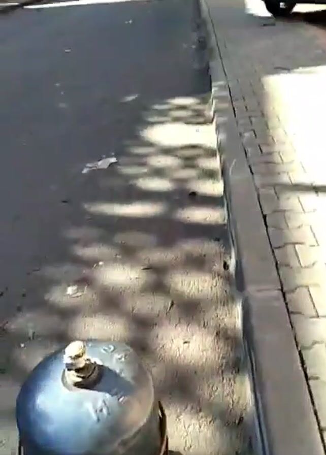 small propane tank sitting on the ground near a curb. The tank is gray and blue and has a brass fitting on top. It is surrounded by a copper-colored metal cage. The ground is asphalt with some debris. The street is visible in the background with a car parked on the side. The camera is moving slightly, causing the image to shake. There is a loud rattling noise that persists throughout the video.