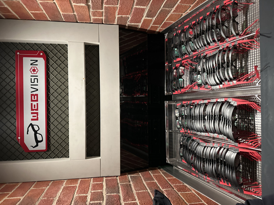 The image depicts a glasses dispensing or storage unit located in Chessy, France. A red-brown brick wall flanks both sides of a built-in structure. The upper section features a light-colored frame surrounding a dark metal grid, on which a red and white sign displays "WEBVISION" alongside a black stylized glasses icon and a camera shutter icon. Below this, a dark, reflective surface occupies the mid-section. The lower half of the unit contains multiple rows of specialized glasses, each with a black frame and prominent red earpieces, meticulously arranged in silver-colored mesh trays. Approximately four such trays are visible, uniformly populated with the glasses. No individuals are present in the scene.