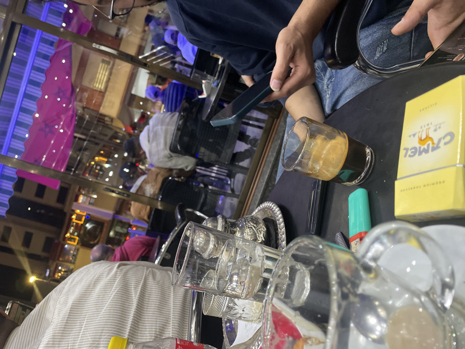 The image presents an interior perspective from a cafe or restaurant in Meknes, Morocco, looking out onto a city street at night through a glass partition. In the immediate foreground, a black tabletop holds a clear glass cup with a handle and spoon, a light green plastic cigarette lighter, a sealed yellow carton of "Camel" brand cigarettes, and a small clear glass containing a dark liquid, consistent with espresso. The hands of an individual wearing a dark blue long-sleeved shirt and blue jeans are visible, holding a dark-colored smartphone in an upright position. To the left, the back and shoulder of another person in a white striped shirt are partially seen, alongside a red-labeled bottle and a silver ornate tray containing a half-full water glass, another clear glass, and a small decorative silver vessel. Beyond the glass partition, an outdoor seating area is visible, populated by several individuals. Figures include a person in a red hoodie, another in a brown jacket with a light-colored hood, and multiple others in casual attire, some wearing blue caps. The background reveals a city street scene at night, illuminated by streetlights and lights from multi-story buildings. A prominent pink and purple striped awning adorned with white star patterns is visible over the exterior establishment, and reflections of lights are apparent on the glass.