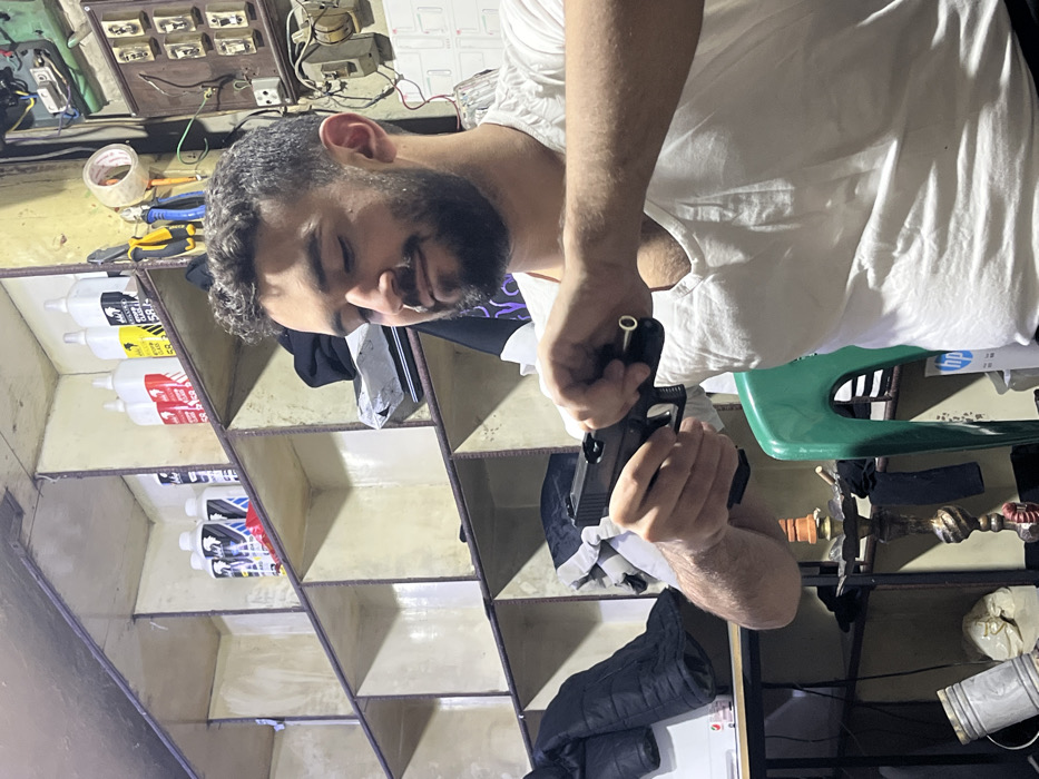A bearded man wearing a white t-shirt is shown holding a black pistol. The gun is positioned in front of him, and he is manipulating a tool near the weapon's slide. The scene is cluttered, with shelves containing bottles and other items visible behind the man. Electrical panels and tools are attached to the wall. A green chair and a black jacket are also present. The image is slightly rotated counterclockwise.