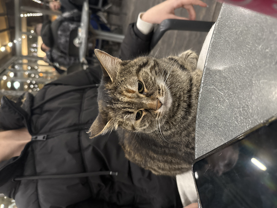 - "A brown and black tabby cat is positioned centrally, resting on the lap of a person seated at an outdoor or semi-outdoor establishment in Plovdiv, Bulgaria" by FM-cObir1, licensed under CC BY 4.0