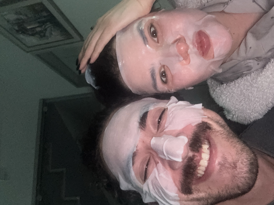 This image captures two individuals, an adult male and an adult female, indoors in Primorsko, Bulgaria. Both subjects are wearing white facial sheet masks. The male, situated on the left, displays dark curly hair, a mustache, and beard stubble. His eyes are partially closed, and his mouth is open in a wide smile, revealing his teeth. The female, positioned on the right, has dark hair, with her left hand touching her head; her fingernails are painted dark. Her eyes are wide open, and her lips are pursed forward, with the mask slightly peeled back from her lower lip. She is wearing a grey, textured robe over a light-colored, patterned pajama top. The background is dimly lit, revealing a framed picture on a wall in the upper right quadrant and indistinct interior elements to the upper left.