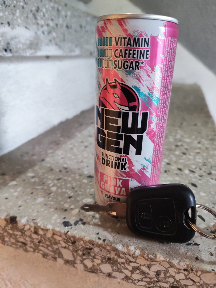 An upright, unopened "NEW GEN" functional drink can, "PINK GUAVA" flavor, rests on a light-colored terrazzo-style tiled floor. The can's design is predominantly pink, white, and black, featuring a stylized pink devil head logo and text indicating "VITAMIN," "CAFFEINE," and "SUGAR*." To the right and slightly in front of the can, a black remote car key fob with an attached silver key blade lies horizontally on the same tiled surface. The background consists of an ascending flight of stairs, constructed from a similar light-colored, speckled material. The scene is situated in Beloslav, Bulgaria.