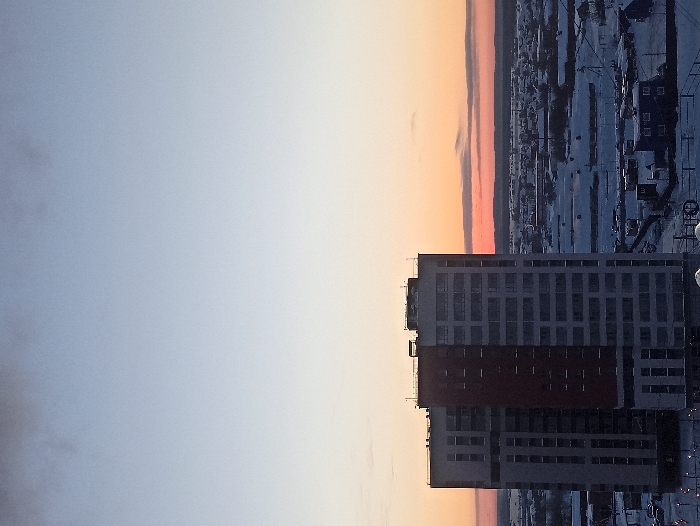 The image displays a winter twilight scene in Кондратово, Russia. A multi-story, modern residential building complex, characterized by light gray and reddish-brown facades and numerous rectangular windows, stands prominently in the midground, dominating the left-center portion of the frame. The foreground reveals indistinct dark structures and railings, lightly covered in snow, suggesting an elevated vantage point. Beyond the main building, the landscape consists of a vast expanse of snow-covered ground extending to the horizon, populated by numerous smaller, low-rise residential buildings, bare trees, and visible roadways. The sky above transitions from a pale blue directly overhead to warm orange and pink hues along the distant horizon, indicative of either sunrise or sunset. Faint, dark clouds are visible in the upper left sky. No individuals or active human interactions are clearly discernible within the frame.