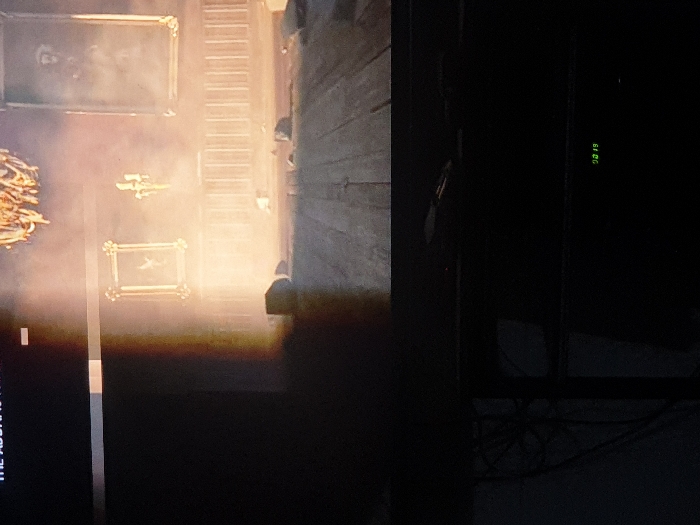 The image displays a dark room containing a television or monitor, which occupies the upper half of the frame