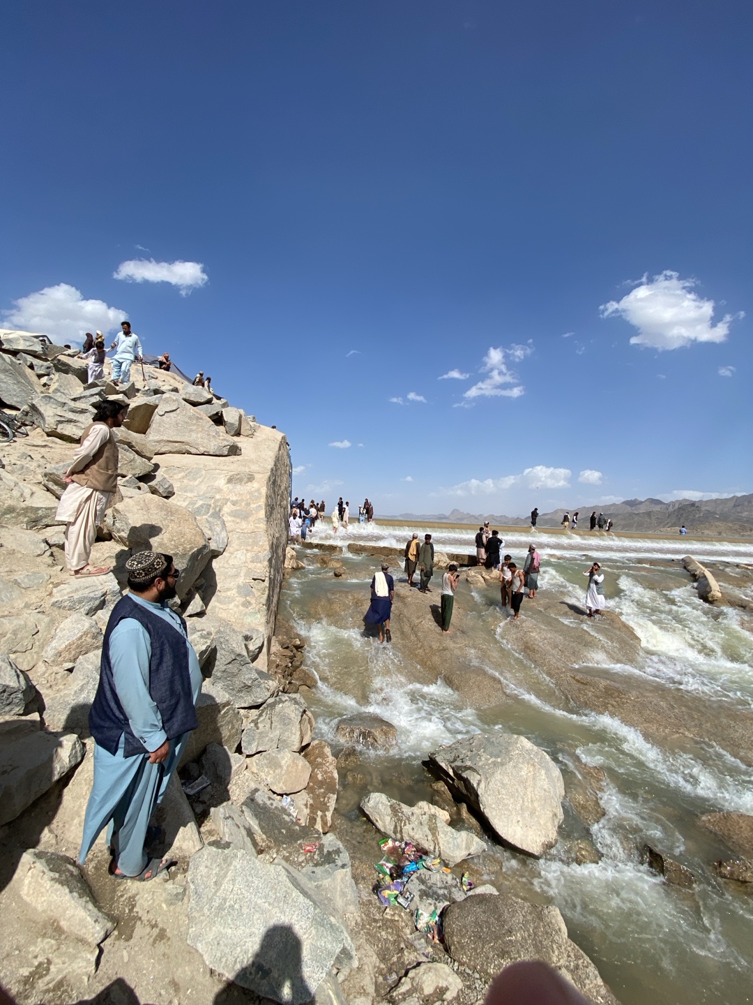 The image captures a scene in what appears to be the city of Kim, Afghanistan, during daylight under a partly cloudy sky. A group of people are gathered on a natural rock formation, with water flowing down the surface. Some individuals are standing on the rocks, while others are walking or wading through the water. The terrain is rocky and rugged. Some of the men in the image are wearing traditional clothing, including vests and headdresses. In the foreground, a man is standing on the rocks, wearing a light blue outfit with a dark vest. There is litter, including what appears to be plastic wrappers and containers, near the water's edge. In the background, hills or mountains are visible on the horizon.