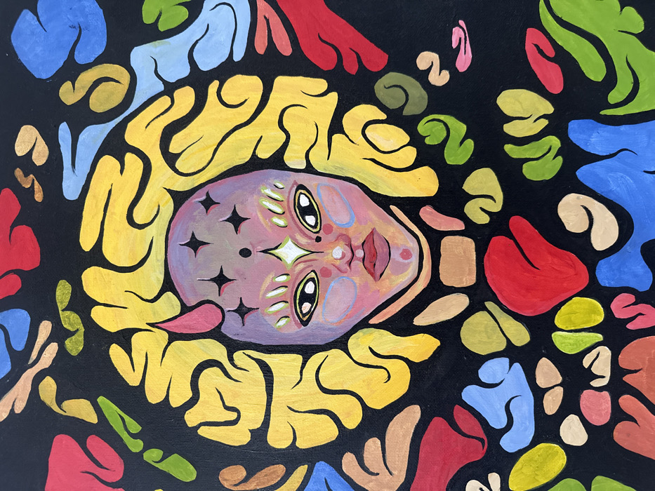 The image displays a vibrant, stylized painting featuring a central humanoid or alien-like head against a black background
