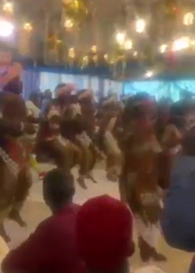 The video depicts a large group of people dancing in a room decorated with lights. Most of the dancers are wearing what appears to be traditional clothing. Several people are watching the performance, seated on chairs. The room is decorated with lights hanging from the ceiling and blue and white curtains.