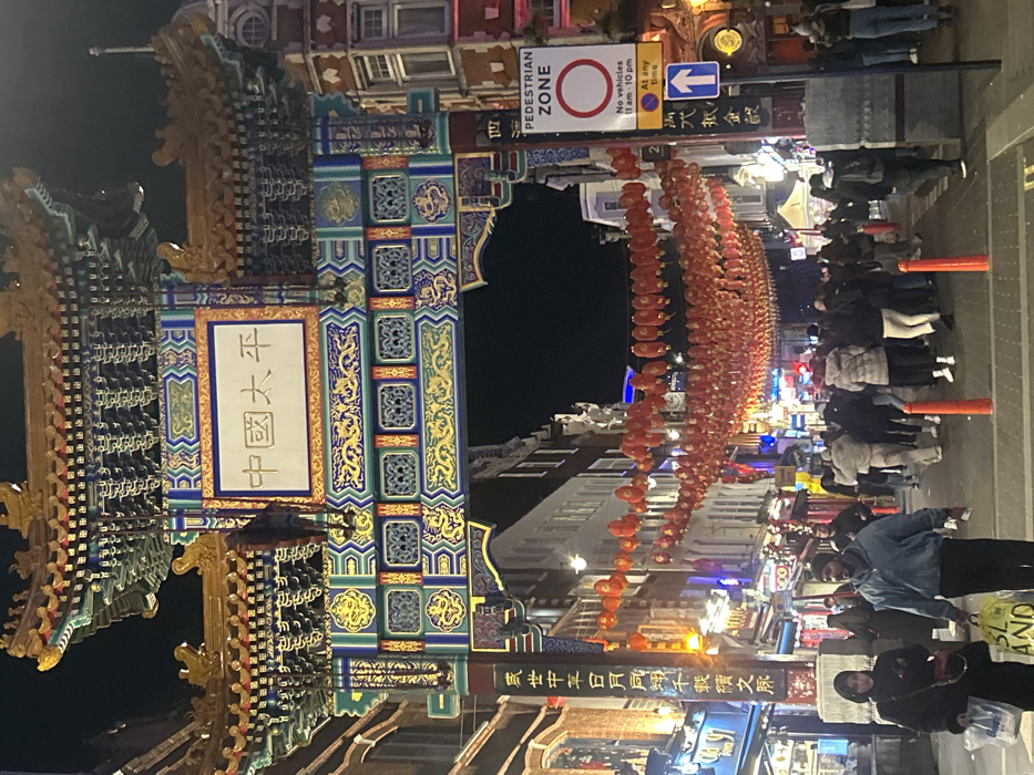vibrant scene of Chinatown at night. A traditional Chinese gate, adorned with intricate carvings and Chinese characters (中國太平), stands prominently at the entrance. Strings of red lanterns line the street, creating a festive ambiance. Pedestrians stroll along the street, with shops and buildings visible in the background. A sign indicates "PEDESTRIAN ZONE," restricting vehicle access during specific hours.