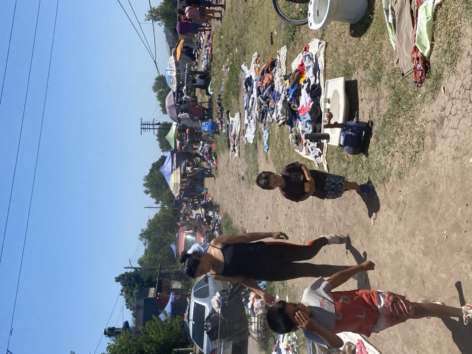 A bustling outdoor market is captured with clothes and items spread on the ground