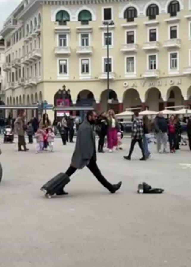 man in a gray coat and black pants walking across a plaza in a public area, pulling a black suitcase behind him. He is walking with long strides, drawing attention from passersby. Other pedestrians, including families with children and couples, are scattered around the plaza. In the background, a large, ornate building with numerous windows and an awning can be seen, with the word "OLYMPION" displayed prominently. There are also tables with umbrellas, and a person on a bicycle.