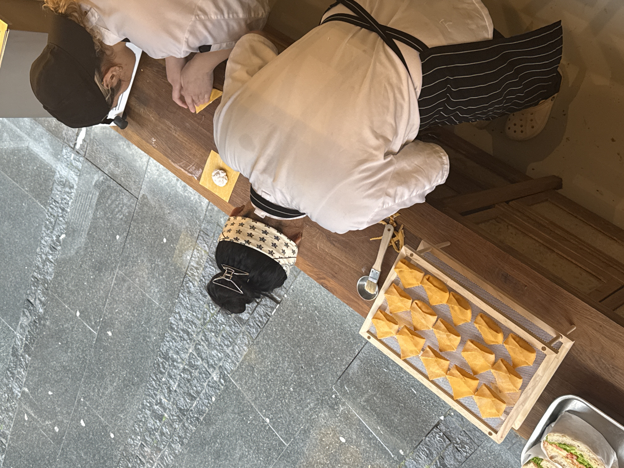 Captured from an elevated perspective, the image reveals an interior setting, likely a kitchen, where culinary activities are in progress. Three individuals are present, all appearing to be engaged in food preparation. Two of them, attired in chef's whites and black caps, are seated at a wooden workbench. The third individual, donning a headband with stars and black hair, is positioned adjacent to them. The workbench is the primary focal point, featuring an assortment of food items. Freshly prepared pasta, arranged neatly on a wire mesh tray, lies adjacent to a metal tray containing sandwiches. Additionally, a small quantity of what appears to be filling rests on a yellow square of pasta dough. A pizza cutter rests on the workbench near the pasta tray. The floor is paved with square granite tiles, their gray hues providing a neutral backdrop. The location is identified as Unknown, Unknown.