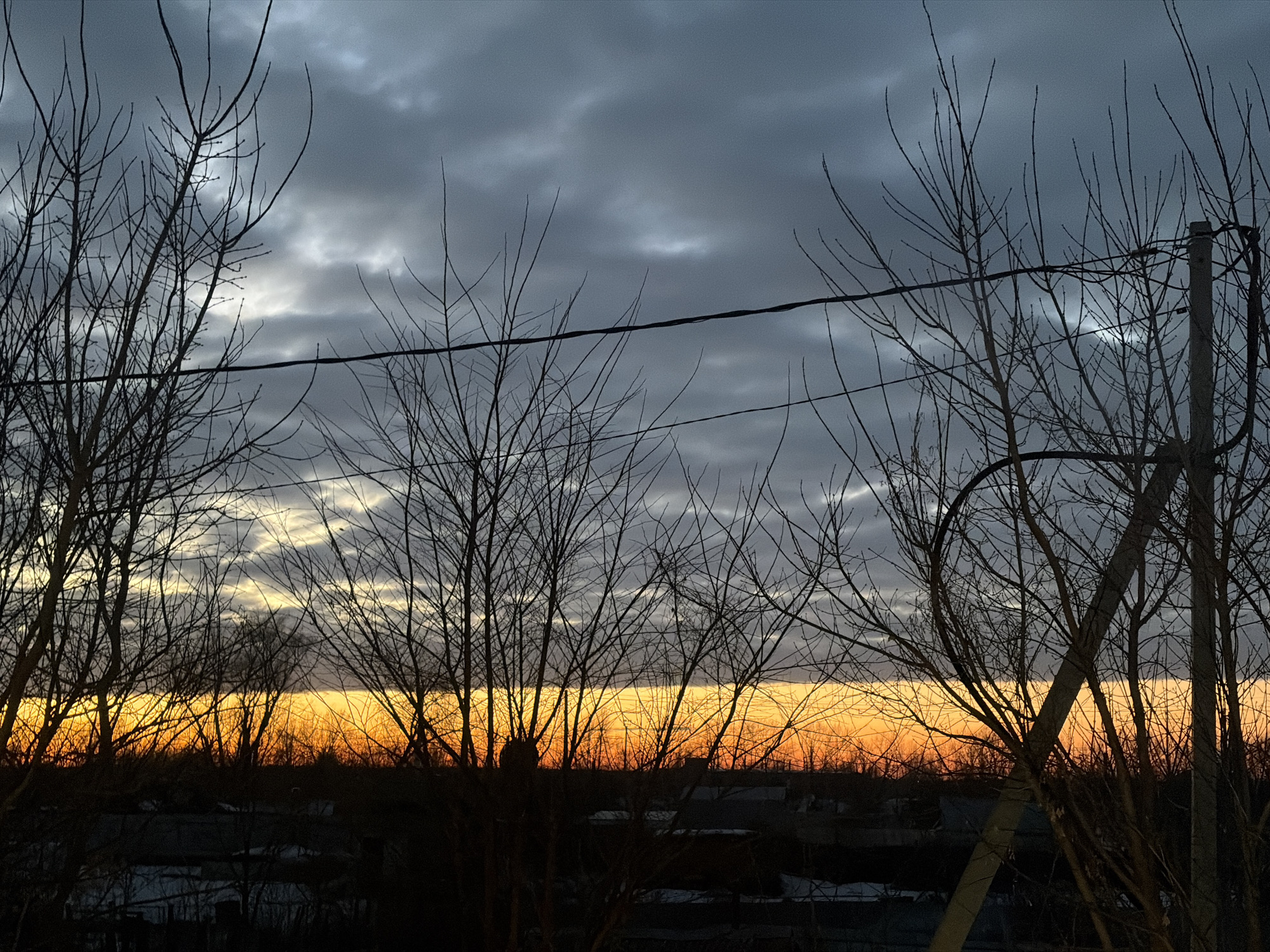 The image captures an outdoor scene at either sunrise or sunset over the city of Chaikovsky, Russia. A distinct, horizontally oriented band of intense orange and yellow light dominates the lower sky along the horizon. Above this luminous band, the sky is filled with dark grey, heavily clouded formations, interspersed with lighter grey and white patches. Numerous bare tree branches, devoid of leaves, are prominently silhouetted in the foreground, partially obscuring the sky and the horizon. A thin, dark utility wire runs horizontally across the mid-upper portion of the frame, passing between and behind some of the tree branches. A concrete utility pole is partially visible on the right side of the image, appearing to support this wire. Below the illuminated horizon, a dark, indistinct silhouette of a cityscape, including various building rooftops, is visible. No individuals, specific actions, or interactions are present in the scene.