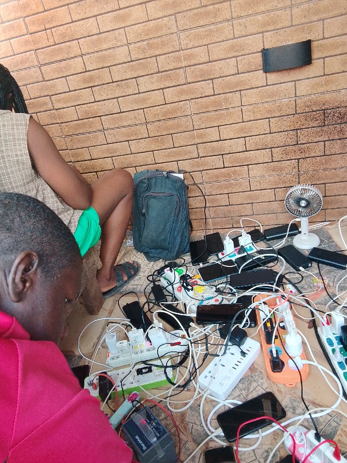 The scene in Agbor, Nigeria, depicts an indoor or sheltered outdoor area with a tiled floor and a light-brown brick-patterned wall. In the foreground, the back of an individual's head, with dark skin and a short haircut, is visible, wearing a red upper garment. This individual appears to be engaging with a complex arrangement of electronic devices. To the left, a second individual is seated, partially visible from the mid-torso downwards, wearing a light-colored plaid or checked garment and green shorts, with braided hair and dark sandals on their feet. The floor area is dominated by an extensive charging setup. Approximately 10-15 smartphones are laid out on the floor, connected to numerous power strips and extension cords via a dense network of charging cables. There are at least 8-10 distinct power strips, varying in color (white, orange, multi-colored), each with multiple outlets, heavily utilized by various power adapters. A Duravolt-branded power unit or battery pack with associated red and black wiring is present near the foreground individual. A small white USB-powered desk fan stands upright on the right side of the floor. A dark-colored backpack rests against the brick wall. A black wall-mounted light fixture is visible on the upper part of the brick wall. The overall scene indicates a concentrated effort to charge multiple electronic devices concurrently.