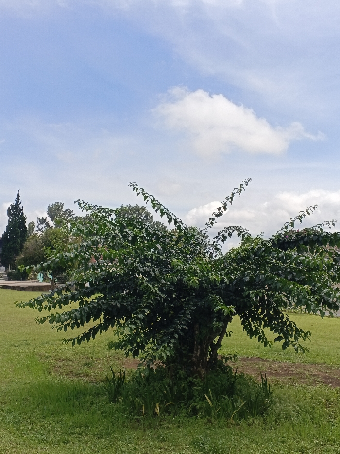 This image captures a daytime outdoor scene in Palayan, Philippines. A densely foliated, multi-stemmed green tree or large shrub occupies the central foreground, rooted in a patch of green grass. The surrounding ground consists of a manicured green lawn extending into the midground, with a faint dirt path or worn area visible to the right of the central tree. In the background, to the left, a tall, slender coniferous tree with dark green foliage stands beside other deciduous trees. A light-colored building with a dark roofline is partially discernible behind the background trees on the left. The sky, which fills the upper half of the frame, is light blue with scattered white cumulus clouds, including a prominent cloud formation towards the upper right. No individuals or animals are present.
