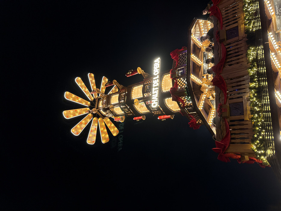 The image displays a brightly illuminated, multi-tiered wooden structure, identified as a Christmas pyramid or a large chalet, at night. The structure is located at the Christmas Market in Strasbourg, France, specifically indicated by the prominent illuminated sign reading "CHALET DE L'OPERA," likely situated near the Opéra national du Rhin. The pyramid is constructed from dark-stained wood and features numerous warm-toned electric lights outlining its various levels and architectural details. The uppermost section showcases a rotating mechanism with ten paddle-shaped, internally lit blades, each containing star cutouts. Below this, several oversized red candle-like figures are affixed to the structure's exterior. The lower, wider platform of the chalet is enclosed by a wooden railing and extensively decorated with large red fabric bows and green garlands strung with small white lights. Approximately five to seven individuals are visible on this platform, standing and observing the surroundings. Their faces and specific actions are indistinct due to the distance and ambient lighting conditions. The background is uniformly black, indicating a nighttime environment with no other contextual elements visible.