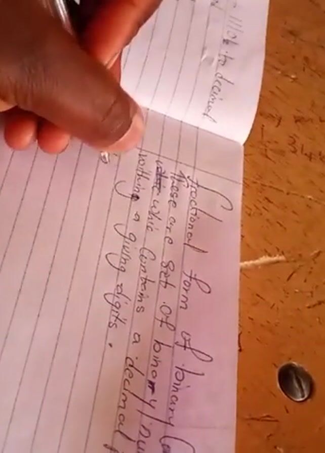 A close-up shot shows a person's hand writing in a notebook. The notebook is open on a wooden desk and contains lined paper. The person is using a pen to write in cursive. The words "Fractional Form of Binary", and then "these are set of binary that will contains a decimal nothing a giving digits" are written. The desk has some writing and markings on it. The person is wearing a beaded bracelet on their left wrist.