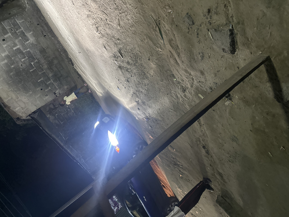 A dark, angular view shows a concrete structure with a wooden beam cutting across the frame. A light source, possibly a flashlight, shines intensely at the base of the structure, creating a bright glare. The floor is rough and dirty. A person's legs and feet are visible at the bottom, suggesting they are holding the light. The scene is dark, with the light source providing the only significant illumination.
