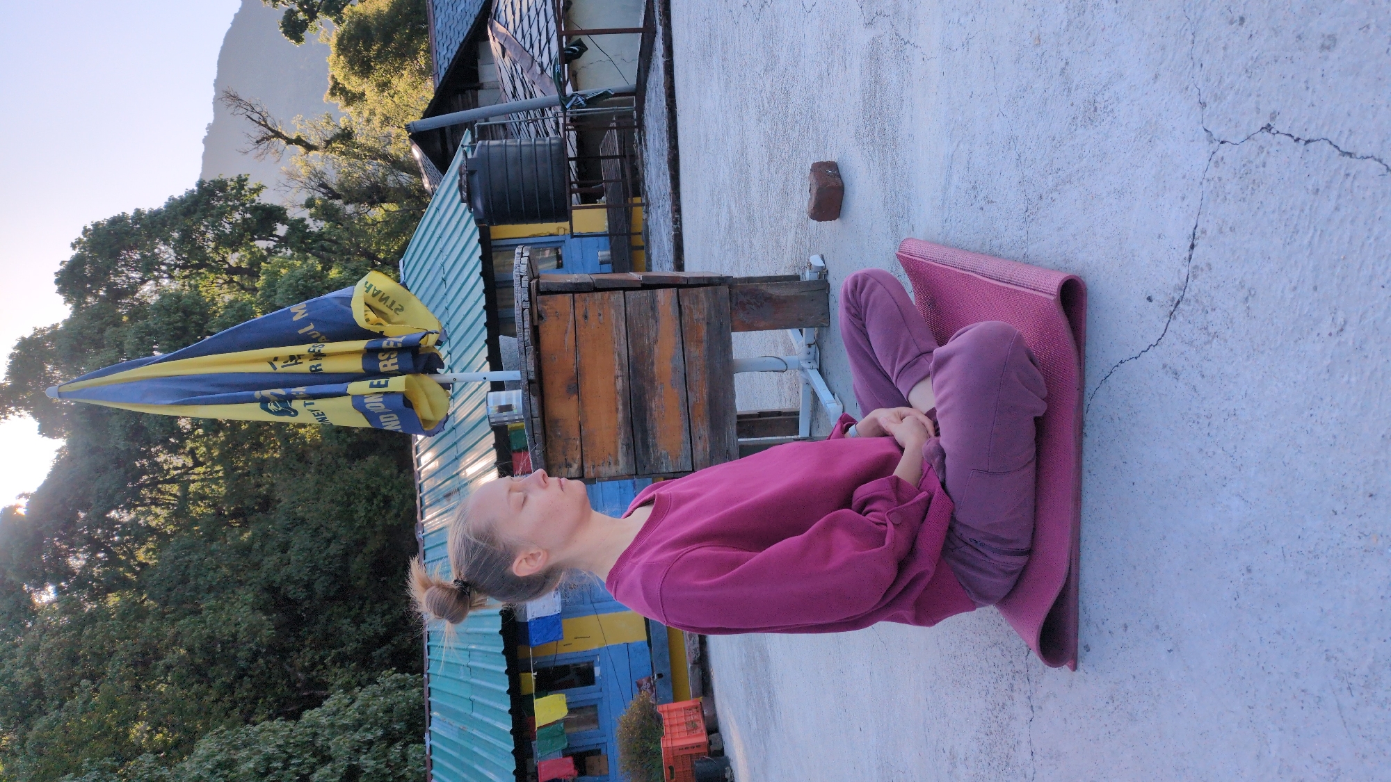 A woman is sitting cross-legged on a pink yoga mat on a light grey concrete surface. She is wearing a maroon sweatshirt and maroon pants. Her hair is pulled back into a bun. A wooden structure and a water tank are behind her. A closed blue and yellow umbrella is to her left. Trees and mountains are in the background. The scene is located in Haini, India.