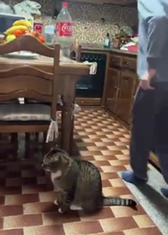 kitchen scene with a young boy dancing near a tabby cat. The boy, wearing a blue patterned long-sleeved shirt and gray pants, enters the frame and dances with a playful expression. The cat sits on the checkered tile floor near a wooden table and chairs. The kitchen has wooden cabinets, a countertop with various items including fruit and a Coca-Cola bottle, and an oven.