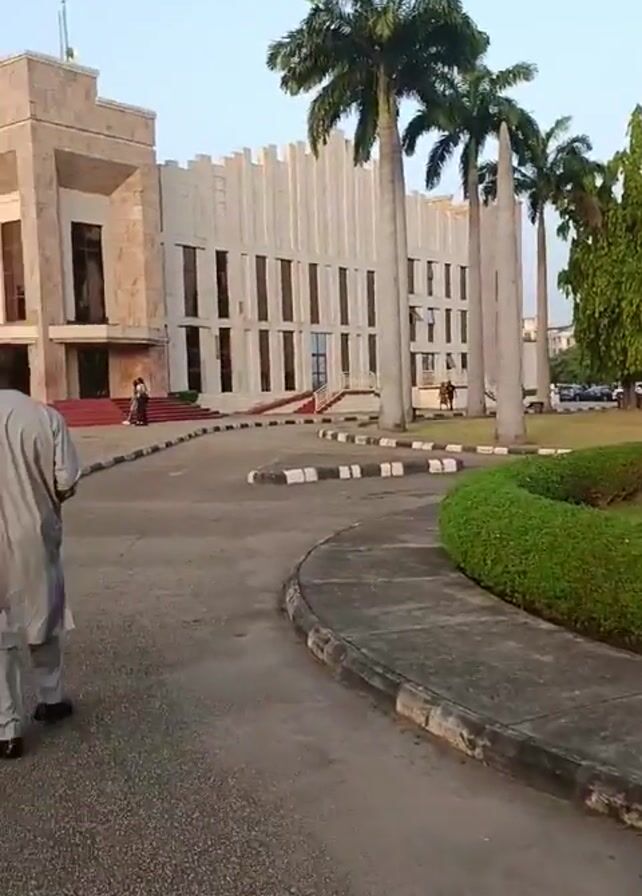 paved driveway in front of a large, imposing building with a modern architectural design. The building has a light-colored facade with vertical window slots and prominent architectural features on its roof. Palm trees are strategically planted along the driveway, adding to the overall aesthetic of the area. There are several people walking on the driveway, heading toward the building, they are dressed in a variety of attires. The environment is bright and open. The scene has a formal or governmental feel, given the architecture and general upkeep of the surrounding space.