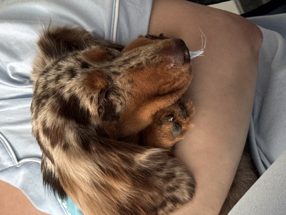 A dog with brown and grey mottled fur is sleeping on a person's arm