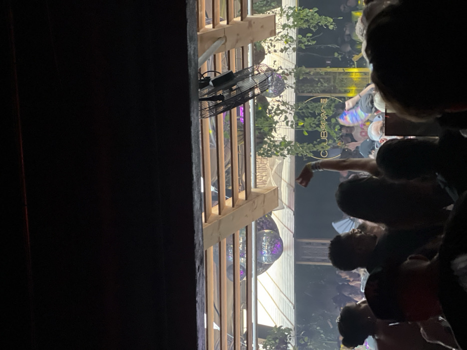 crowded indoor space in Homestead, Florida, specifically at the "Clubspace" nightclub, which is located at the coordinates 25.784, -80.193. The scene is captured from a low angle, looking up at a partially covered ceiling with a wooden framework and a large fan. The ceiling is partially obscured by hanging plants. The room is filled with people, some dancing, others talking and standing around. There are several disco balls hanging from the ceiling. The overall atmosphere is lively and celebratory. In the foreground, a group of people are partially obscured by the low angle, with a woman in the center raising her arm in the air. The lighting is dark, but there is a bright glow emanating from the disco balls and the stage area, which has the word "Clubspace" illuminated in gold letters. The image suggests a nightclub setting, with a DJ booth and dance floor visible in the background.