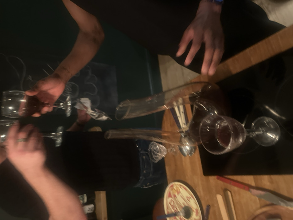 A blurry overhead shot displays two people, one with tattoos, at a dark-green-topped table. A glass decanter sits on a wooden surface beside the table. One person pours wine from a glass into the decanter, while the other's hands rest on the wooden surface. Wine glasses are scattered nearby. A game with a circular board and red/white markings sits at the table's edge. Chopsticks and a knife are also visible. The scene appears to be a social gathering involving wine.