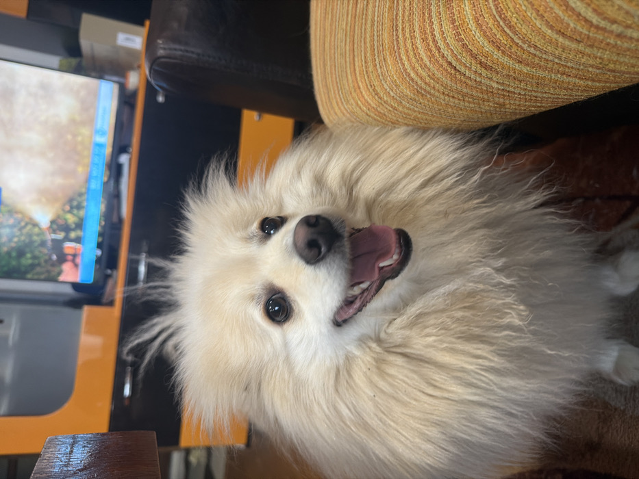 The image portrays an indoor scene located in the city of Devin, Bulgaria. The central subject is a small, cream-colored, long-haired canine, consistent with a Pomeranian breed, positioned at eye level and facing forward. The animal's mouth is open, revealing its pink tongue and several teeth, and its dark, round eyes are directed towards the viewer. The fur on its head exhibits a slightly spiky or dishevelled appearance. To the immediate right of the dog, a section of an upholstered object, likely a chair or sofa, is visible, featuring a textured striped pattern in shades of orange and yellow. A dark brown wooden surface is partially present on the dog's left. In the background, a modern furniture unit, possibly a media console or cabinet, is observed with prominent orange top and side panels and dark, possibly black, drawers or compartments below. Resting on this unit is a television screen displaying a brightly lit scene, appearing to be an outdoor landscape with foliage, and a blue interface element is visible towards the bottom of the screen. No human subjects are present in the frame.
