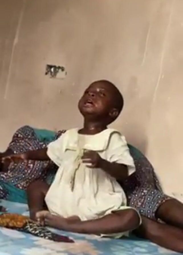 A young child is seated on a bed and crying