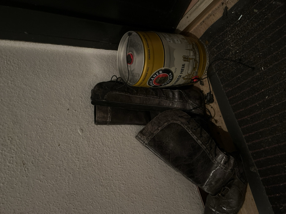 The image displays an indoor scene, likely a dimly lit corner next to a doorway. Two dark, worn, lace-up boots are positioned on the left foreground, leaning against a textured, light-colored wall. One boot stands upright, while the other rests on its side, partially overlapping the upright one, with its laces visible and somewhat tangled on the floor. To the right of the boots, a golden-yellow Paulaner Münchner Hell mini-keg, approximately 5 liters in size, stands upright on the floor. The keg features the Paulaner logo and an illustration of what appears to be a European cityscape. A red tapping mechanism is visible on the top of the keg. The floor beneath the boots and keg consists of a dark, striped mat, possibly a doormat, which appears slightly soiled with debris. A dark vertical doorframe or partition is visible on the far right, bordering the scene. A thin wooden threshold or floorboard runs along the base of the wall and doorframe. The textured wall shows minor scuffs or imperfections. The image does not contain identifiable landmarks to confirm the specific city of Heidelberg, Germany, though the presence of the Paulaner Münchner Hell keg indicates a German context.