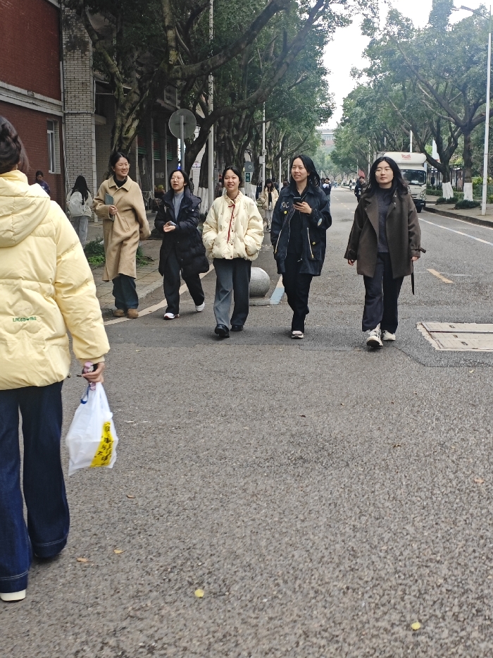 The scene depicts a street in the Chongqing High-tech Zone, China, on an overcast day. The foreground shows an asphalt road surface with scattered yellow leaves and a light blue painted line beside a spherical concrete bollard. In the immediate foreground, a person, seen from the back, walks towards the mid-ground. This individual wears a light yellow hooded puffer jacket with "LIKESING" visible on the lower back, and wide-leg dark blue jeans with white soles on their shoes. They hold a white plastic bag with yellow text and graphics in their right hand. In the mid-ground, a group of five individuals walks abreast, generally moving towards the viewer on the left side of the road. From left to right: 1. A person wearing a long, light tan trench coat over dark pants and brown shoes, carrying a light-colored book or tablet in their left hand, smiling. 2. A person in a dark puffer jacket, dark pants, and white sneakers, wearing glasses, with hands clasped in front. 3. A person wearing a cream-colored puffer jacket with red string details, dark grey pants, and black shoes, smiling. 4. A person in a dark jacket with "IOC" on the left chest, dark pants, and white shoes, holding a black smartphone in their right hand, smiling. 5. A person in a dark brown overcoat, dark grey turtleneck, dark wide-leg pants, and white sneakers. The background features a multi-story brick building on the left. A continuous line of mature trees with thick, twisted trunks and green foliage borders the street on both sides, suggesting an avenue. Further down the street on the right, a white box truck is visible. Several other indistinct figures can be seen walking in the distance. The sky is uniformly light grey, indicating overcast conditions.