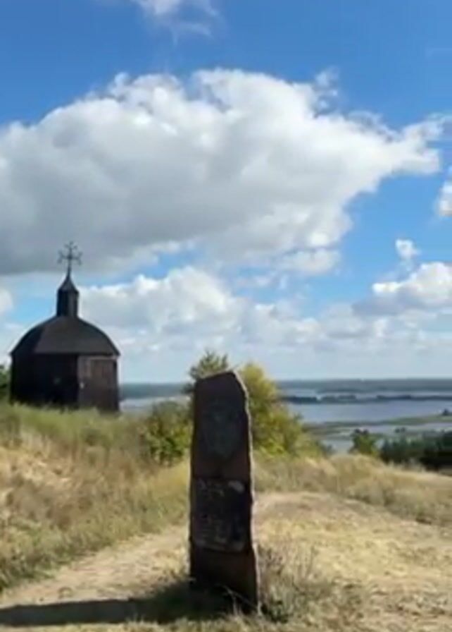 landscape view from a hilltop. In the foreground is a small, wooden chapel with a cross on top, and a stone monument with inscriptions. The midground consists of a grassy slope and some scattered trees. In the background, a wide river or lake stretches out to the horizon, with green islands and trees dotting the water. The sky is blue with scattered white clouds. The camera pans slightly to the right, revealing more of the river and surrounding landscape. The overall impression is one of a peaceful, rural setting.