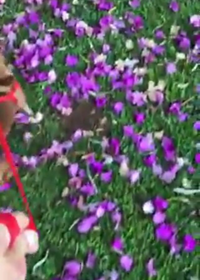 A small brown dog on a red leash is walking on a lawn covered with purple flower petals. The person holding the leash is walking next to another person wearing white sandals. The lawn is green and the petals are scattered all over the grass. There are some patches of dirt visible as well. The camera moves along with the dog and people as they walk.