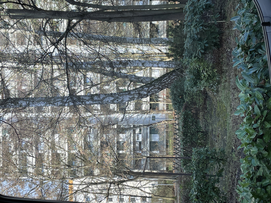 The image depicts a residential urban landscape in Nuremberg, Germany, characterized by multi-story apartment buildings and an intervening green space, typical of post-war high-density housing developments found in areas like Langwasser or Zerzabelshof. In the immediate foreground, a dense row of dark green broad-leaf evergreen shrubs partially obscures the lower edge of the frame. Immediately behind this, a sparse ground cover of dormant grass and exposed soil extends, bordered horizontally by a low wooden lattice fence. Scattered across the midground are several bare deciduous trees, notably including multiple birch trees with distinctive white, peeling bark. Further into the background, multiple large apartment buildings are visible. These structures feature light-colored facades, numerous uniform windows, and visible balconies or external roller shutters, indicative of utilitarian residential architecture. No individuals, animals, actions, or interactions are present in the scene. The environment is illuminated by natural daylight, suggesting a daytime observation during late autumn or winter.