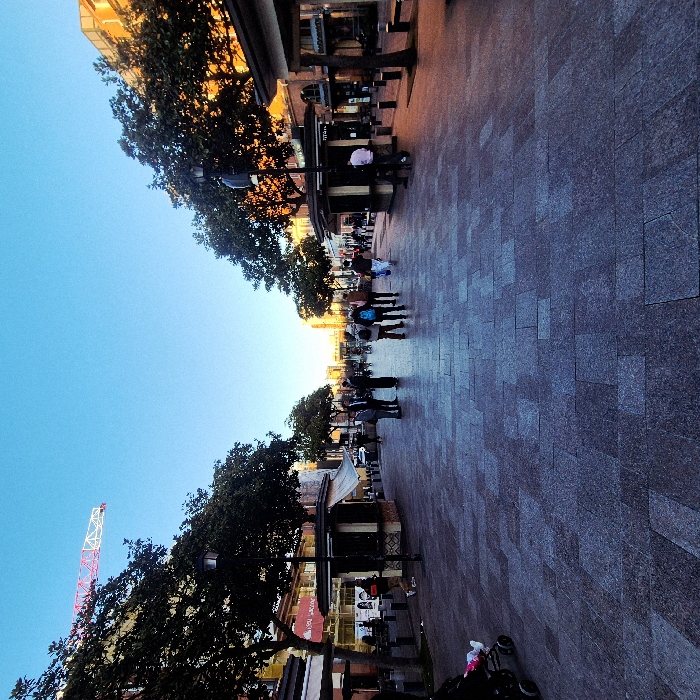 This image depicts a wide, pedestrianized avenue, identified as Allées Jean Jaurès in Toulouse, France, under a clear, light blue sky. Low-angle sunlight from the right illuminates the multi-story buildings on the eastern side of the avenue and at its distant end with warm, orange hues. The foreground and the western side of the avenue are primarily in shadow. A red and white construction crane boom is visible in the upper left quadrant of the sky. The ground is paved with dark grey, rectangular stones laid in a staggered pattern. Both sides of the avenue are lined with deciduous trees featuring green foliage, interspersed with dark street lamps and several dark kiosks equipped with awnings. Approximately 15-20 individuals are present. In the far left foreground, a dark baby stroller is partially visible, containing a limb clad in pink fabric. In the mid-ground, a group of 4-5 men, some wearing suits, are standing on the left side of the avenue. Towards the center-right, a group of 4-5 individuals, some carrying backpacks, are walking away from the viewer. A lone individual in a light pink shirt is walking towards the right foreground. Additional, less distinct figures are scattered in the background. A red banner is partially visible on a building facade on the left.