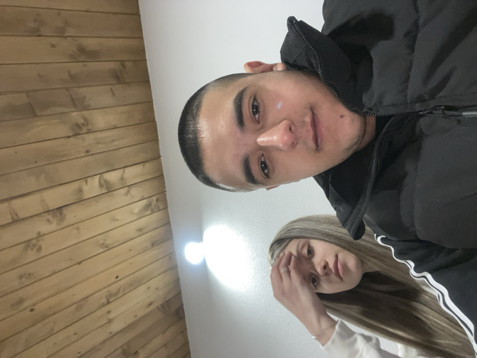 Two individuals, one male and one female, are depicted indoors in what appears to be a close-up photograph or selfie taken in Sopot, Bulgaria. The male, positioned in the foreground on the right, has a short, buzzed hairstyle and is wearing a black puffer jacket. A small, light-colored mark is visible on his left cheek. The female is partially visible on the left, behind and to the left of the male. She has long, straight blonde hair and is wearing a white long-sleeved garment, possibly with black stripes on the sleeve. Her left hand, adorned with a ring on the ring finger, is raised near her head. Both individuals maintain neutral expressions, looking towards the camera. The background consists of a white wall with a bright, circular light fixture on the left, and a wooden plank ceiling with visible grain and knots above.