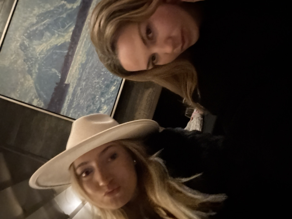 Two young women pose for a selfie, tilting their heads. One wears a wide-brimmed, light-colored hat. Both have blonde hair. The other woman is closer to the camera. They wear dark clothes. Behind them is a framed blue and white abstract painting. The lighting is dim and warm.